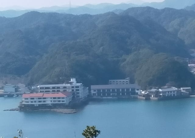 上の写真は勝浦湾展望台(ホテル浦島の狼煙山遊園の展望台)から撮影した大江戸温泉物語Premium越之湯の全景です。