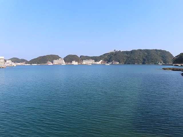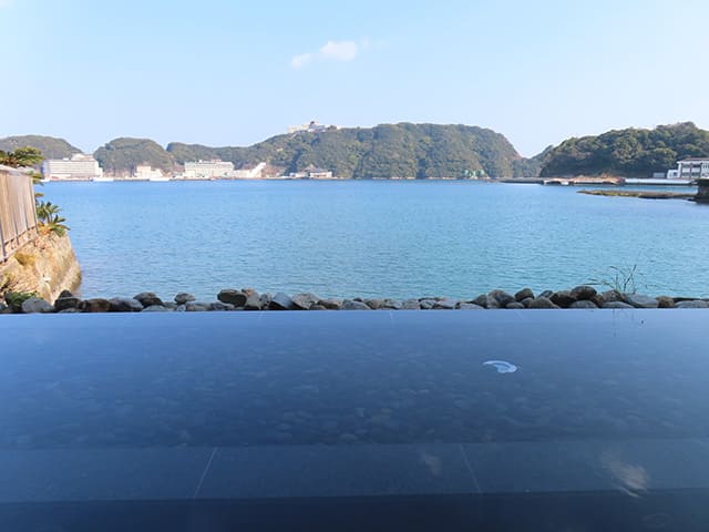 上の写真は越之湯のオーシャンテラスから撮影した景色です。正面に見えるのがホテル浦島(大洞窟風呂・忘帰洞が有名)です。