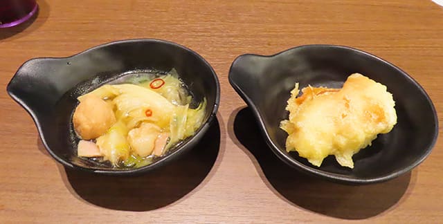 左が「博多もつ鍋」、右が「天ぷら稲荷ずし」です。