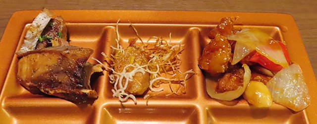左からご当地メニューの「マグロカマのオーブン焼き」「マグロ頭肉の油淋ソース」、中華の定番メニュー「黒酢酢豚」です。