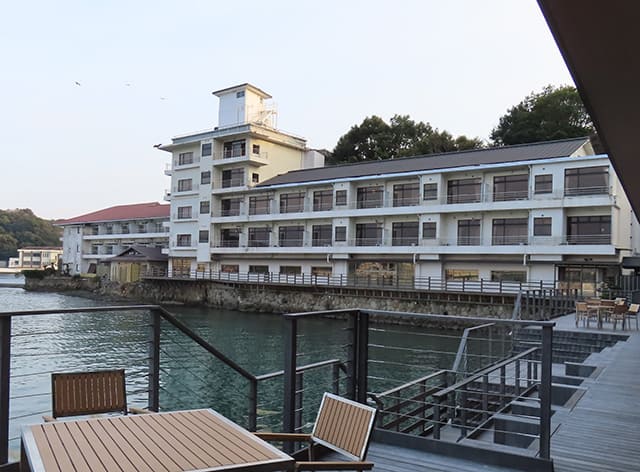 上の写真が越之湯のオーシャンテラスです。海がとっても近いんです。