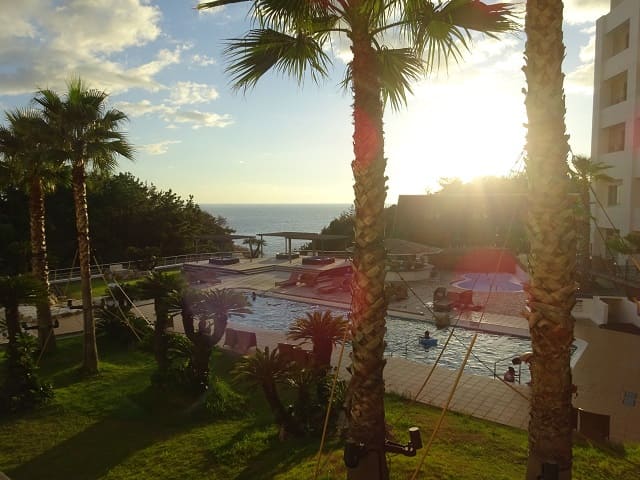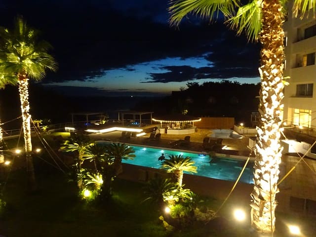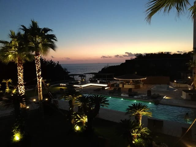 ホテル千畳の中庭には1年中利用できる天然温泉プール(サンセットスパガーデン)があります。
