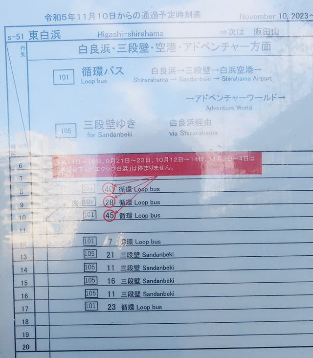 ↓東白浜バス停発「白良浜・三段壁・空港・アドベンチャーワールド方面」の時刻表↓(2024年12月現在)