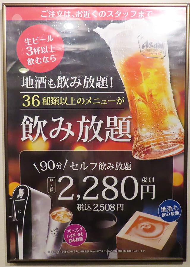 白浜彩朝楽のアルコール飲み放題(最大90分)は、お1人2,508円(税込)です(2024年12月現在)。