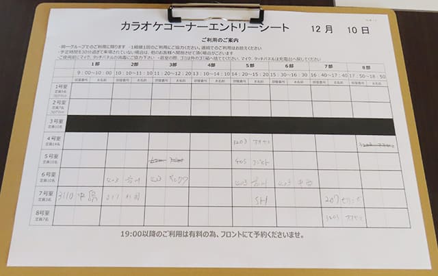 カラオケルームの予約はカラオケルーム入り口付近に設置されたエントリーシートに必要事項(ルームナンバー、名前)を記入して行います。