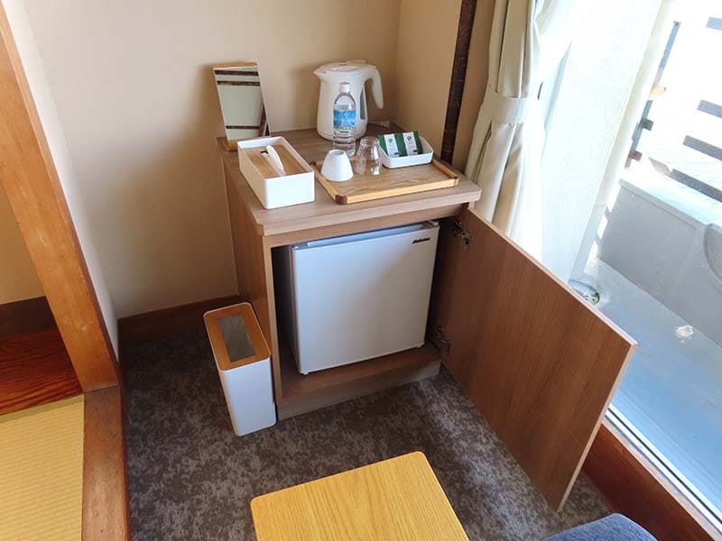 広縁の一角には冷蔵庫などが設置されています。