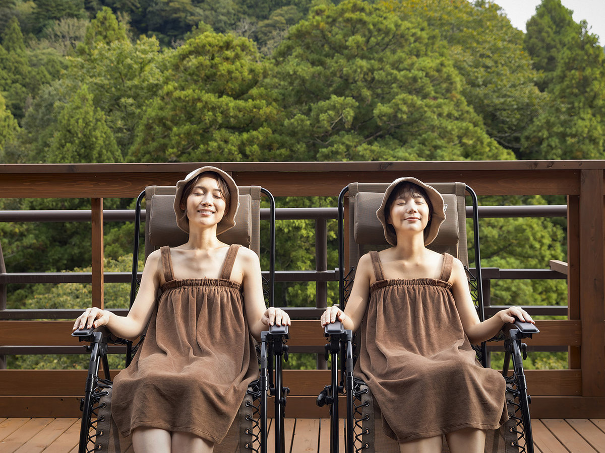 鶴仙渓に面したテラスエリアは開放感が抜群。絶景を楽しみながら至福の「ととのい」を体験できます。